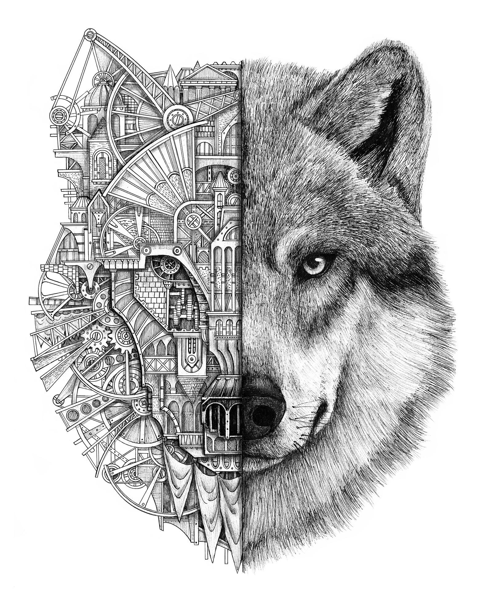 La symétrie naturelle de l’animal permet une composition qui joue sur le contraste des matières, des échelles et des textures. Cette faune urbaine crée un contraste qui vient nous questionner sur l’impact de l’artificialisation de la nature ou, à l’inverse, de l’instinct sauvage et primitif à retrouver dans notre vie urbaine.