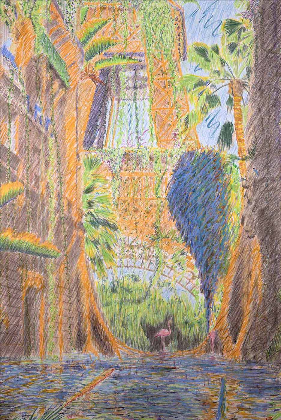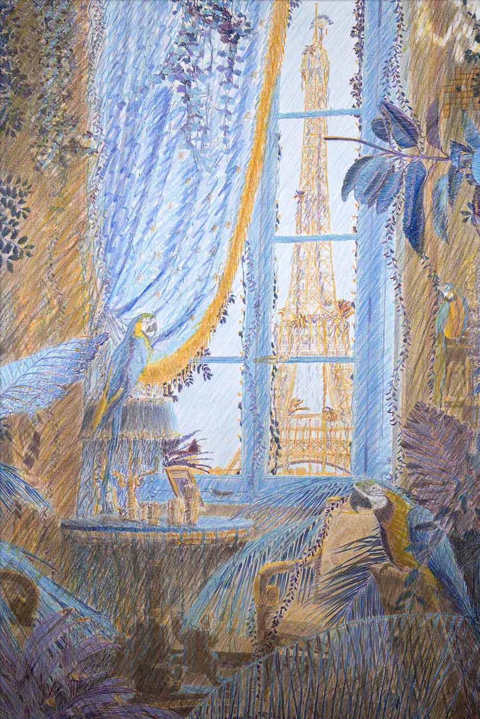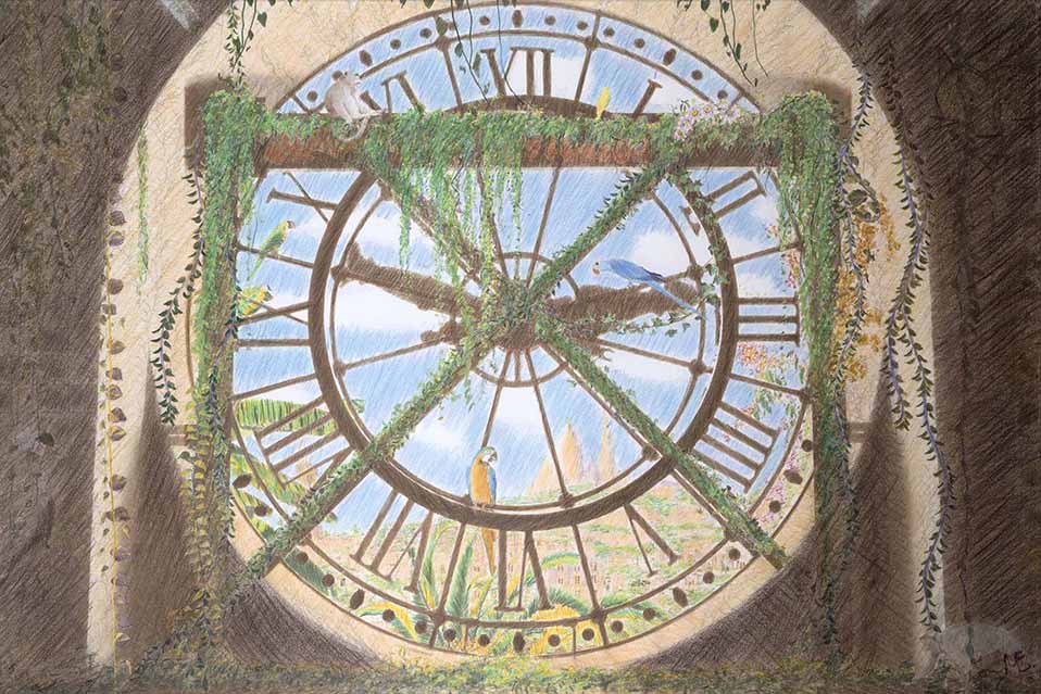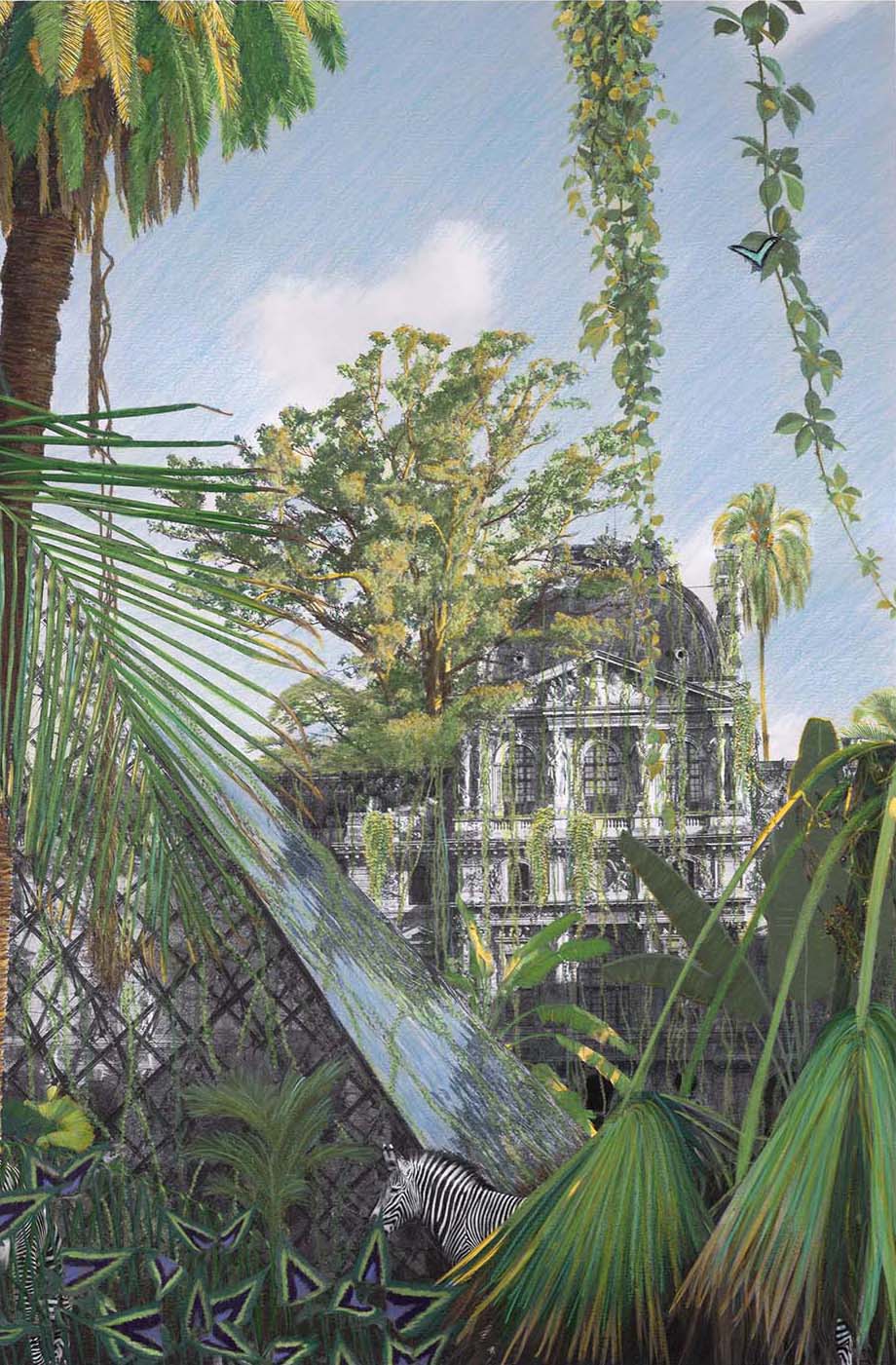 Montage numérique et tirage sur papier d’art rehaussé de pastels et crayons de couleur
