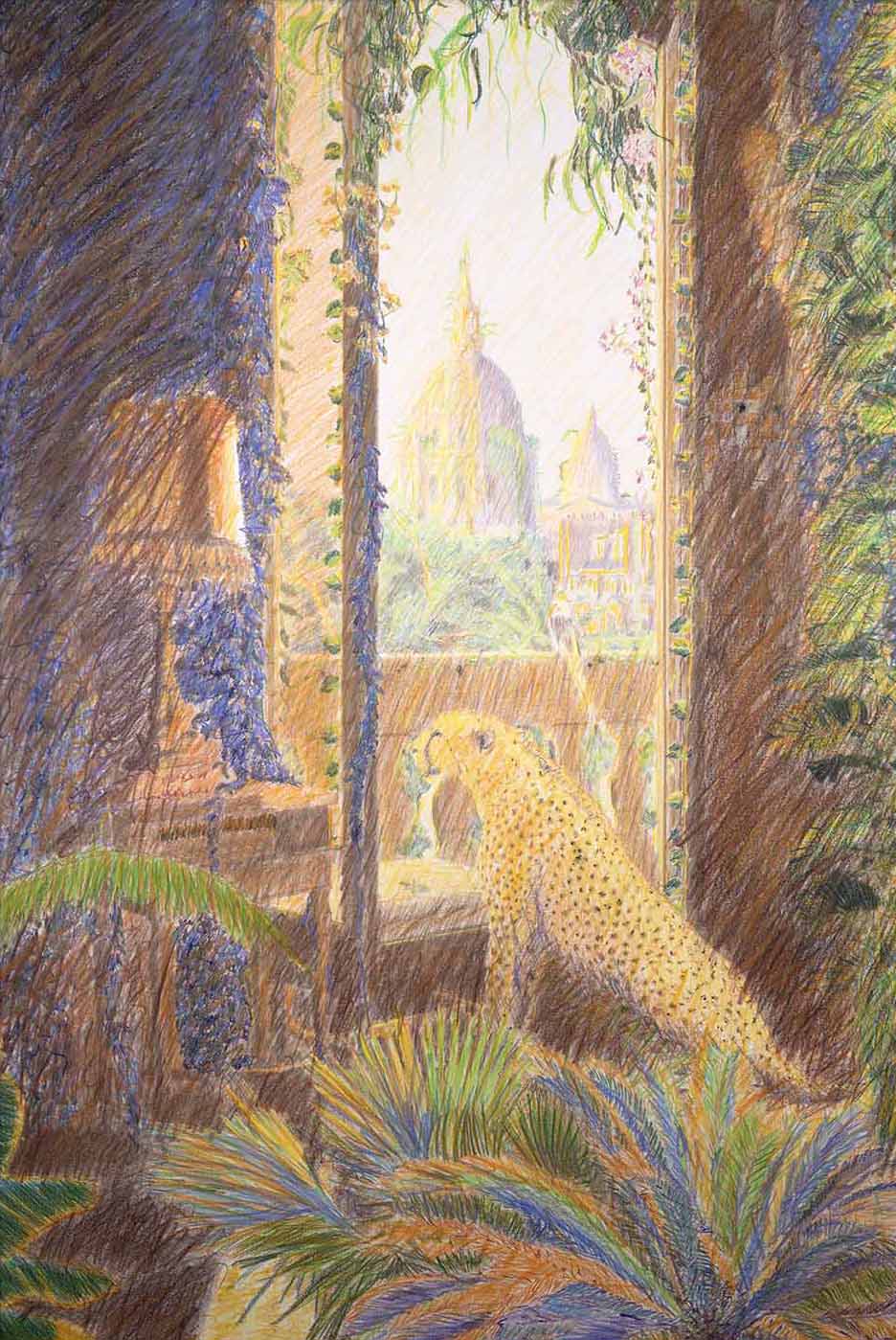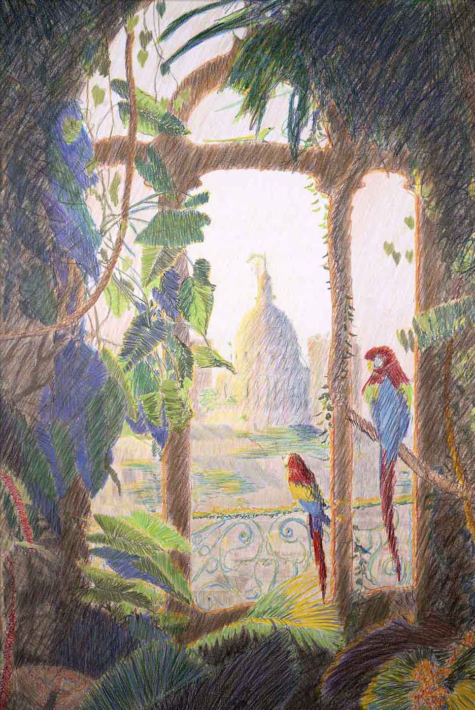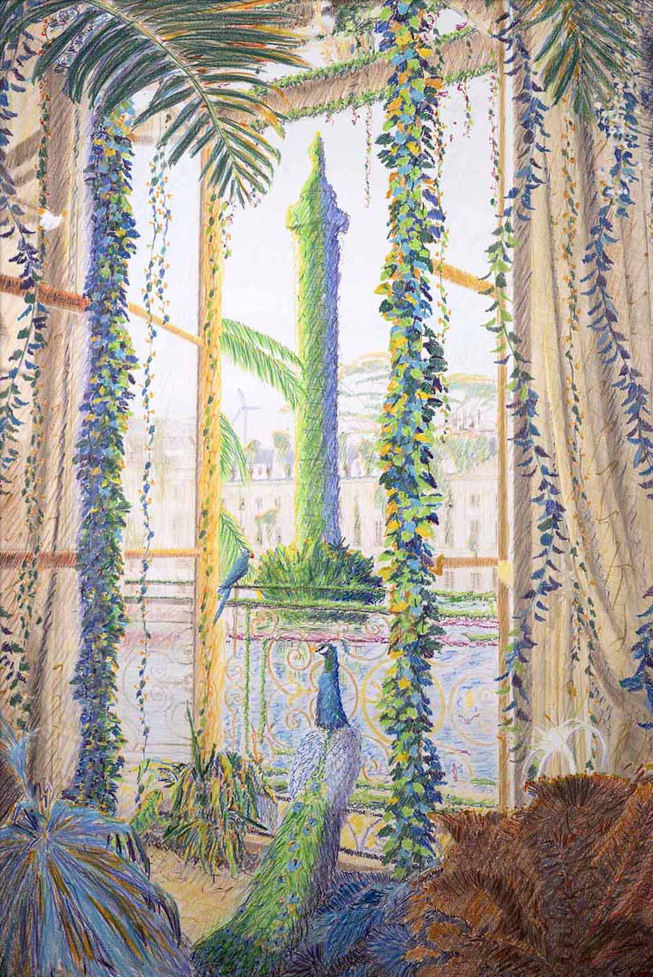 Montage numérique et tirage sur papier d’art rehaussé de pastels et crayons de couleur