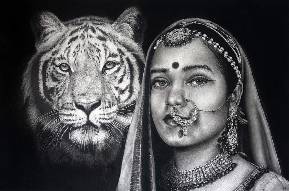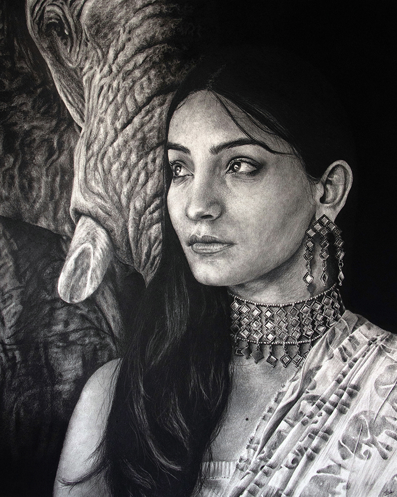 Through the series of drawings “Wild Spirits”, the artist illustrates the force of nature by exploring the deep connection between humanity and the animal world. Made with graphite and carbon pencils, these drawings depict a child as the protagonist, radiating innocence, curiosity and untamed potential, while a wild animal subtly stands in the background, symbolically representing different facets of their personality.