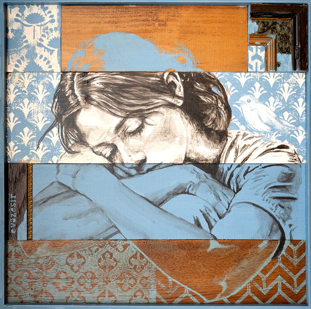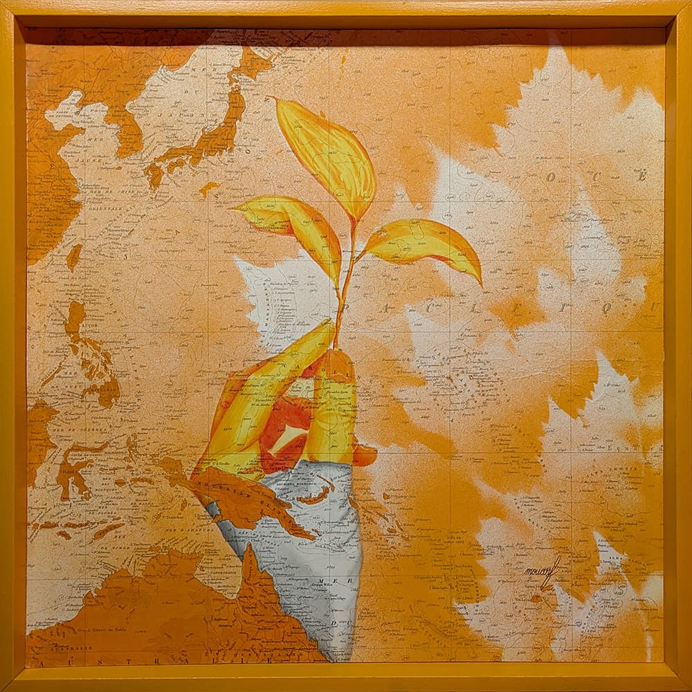 Techniques acryliques mixtes sur support bois teck indonésien avec cadre métal